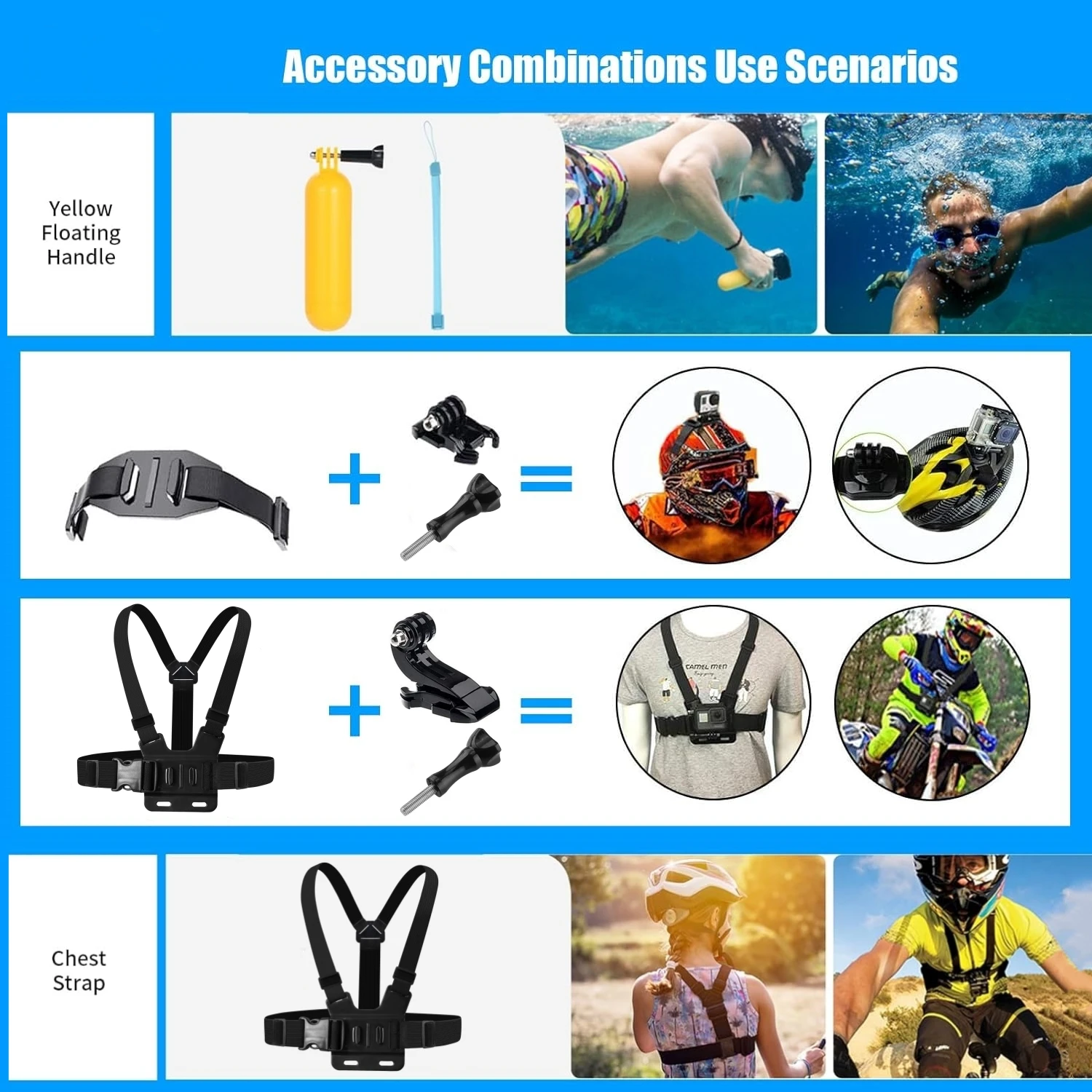 This 11PCS “Action” Camera Accessories Kit is the perfect companion for capturing every moment of your adventure. Designed for GoPro Hero models 13 through 4, as well as Yi 4K, H9, and AKASO cameras, it offers universal compatibility. The set includes essential mounts, straps, and adapters to enhance shooting stability and creativity. Whether you’re biking, skiing, hiking, or diving, this kit provides reliable camera support in every condition. Each piece is made from durable, lightweight materials built to withstand rugged outdoor use. The adjustable straps ensure secure and comfortable attachment to helmets, wrists, or chests. The tripod mount allows for stable shooting and time-lapse recordings. Easy to assemble and compact to carry, it fits neatly into any travel bag. Perfect for vloggers, sports enthusiasts, and adventure photographers. Capture your world from every angle with this versatile and durable GoPro accessory kit.