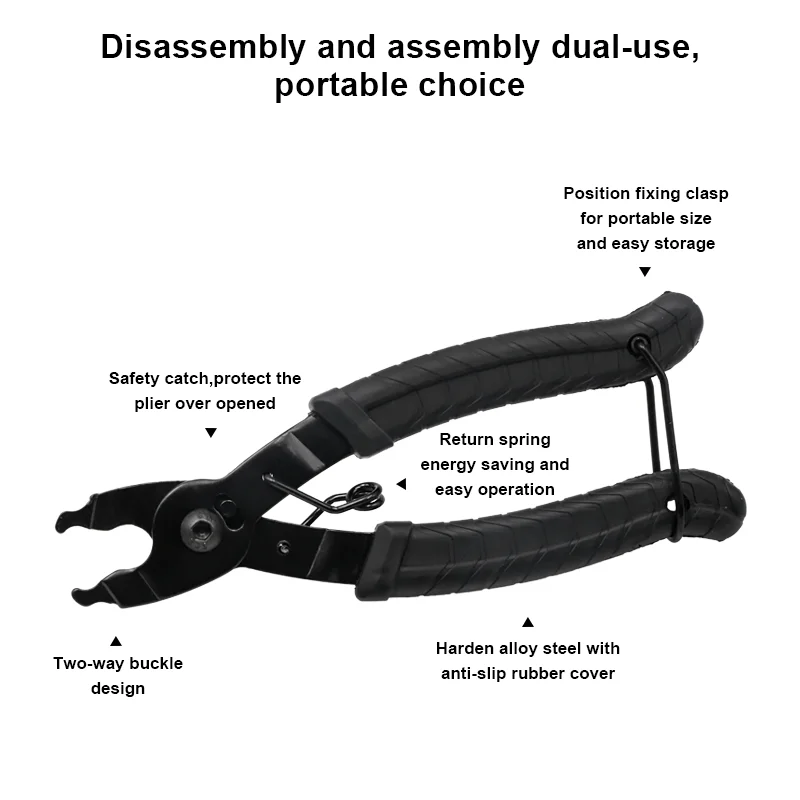 Durable bicycle chain buckle pliers designed for quick-release link removal and installation. Perfect for road and mountain bikes, this handy tool makes chain repair, replacement, and maintenance easy.