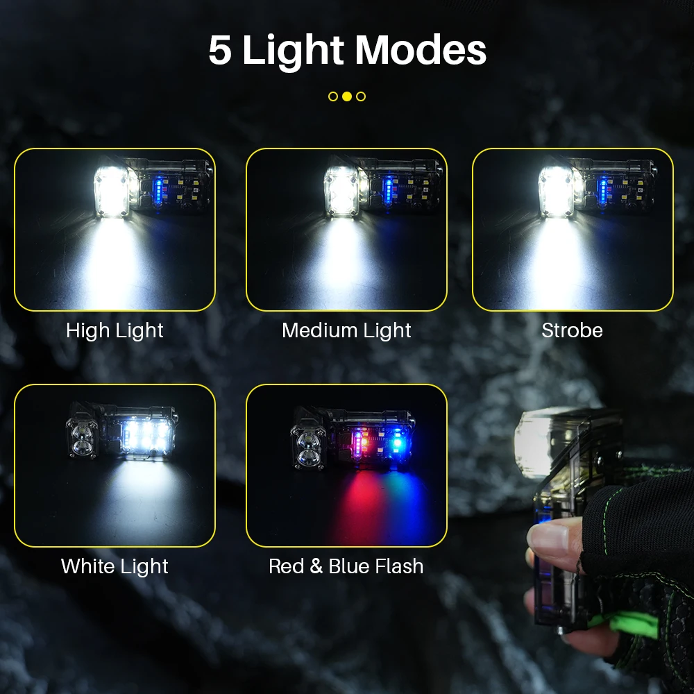 This 90° tilt rechargeable keychain flashlight is a versatile lighting tool for any situation. It delivers up to 800 lumens of bright and clear illumination. The Type-C rechargeable battery allows for quick and convenient charging. Its sensor headlight feature provides hands-free operation for added convenience. A built-in magnet and clip let you attach it to metal surfaces or gear securely. Compact and portable, it fits easily on your keychain, backpack, or belt. Perfect for camping, hiking, work, or emergencies, it ensures you always have light when needed. The adjustable 90° tilt allows you to direct light precisely where you need it. Durable and lightweight, it is built to withstand outdoor conditions. This keychain work light combines portability, brightness, and functionality in one handy tool.