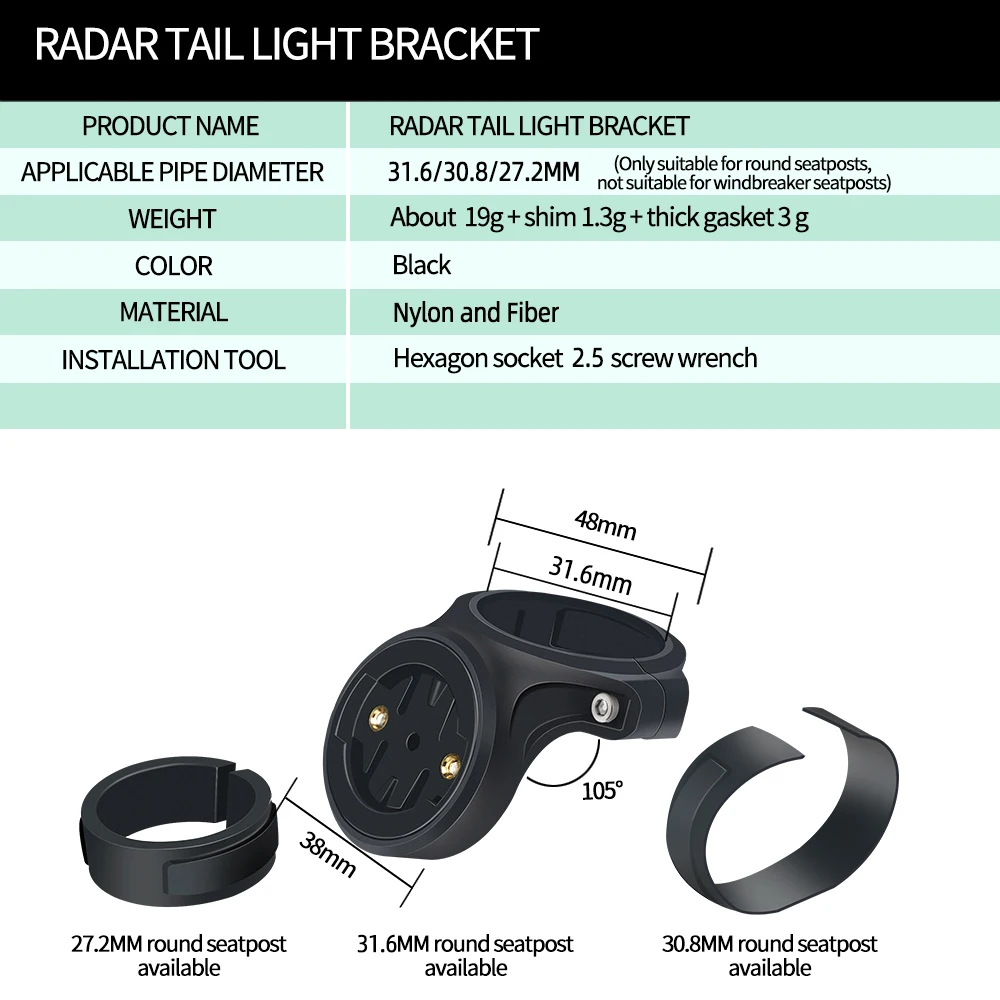This bicycle lamp mount is specially designed for securely attaching taillights to your seatpost. Compatible with Garmin Varia Radar RVR315, RTL510, RTL515, and RTL500, it ensures a stable and reliable fit. Made from durable materials, the bracket withstands daily rides and tough conditions. Its lightweight design won’t add extra weight to your bike. Easy to install, it allows quick mounting and removal without tools. Perfect for both road bikes and mountain bikes, it enhances rear visibility and safety. The tight fit prevents slipping, even on bumpy rides. Compact and sleek, it integrates seamlessly with your bike setup. Ideal for cyclists who rely on Garmin radar and taillight systems. Keep your lights secure and your rides safer with this practical seatpost mount.