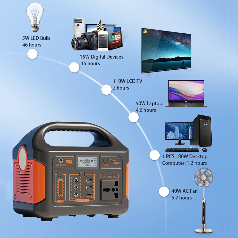 This portable power station provides reliable backup energy for camping, travel, and emergency use. It features long-life LiFePO4 battery technology for safer and more stable performance. Available in 100W, 300W, and 500W models, it meets different power demands. The high-capacity options of 76Wh, 230Wh, and 460Wh ensure extended runtime for essential devices. A built-in BMS system protects against overcharge, overload, and short circuits. It supports solar charging, making it an eco-friendly choice for outdoor adventures. Lightweight and easy to carry, it fits perfectly in backpacks or vehicles. Multiple output ports allow you to power phones, lights, fans, laptops, and more. The 220V AC output makes it versatile for household-style appliances. A dependable power solution wherever electricity is needed